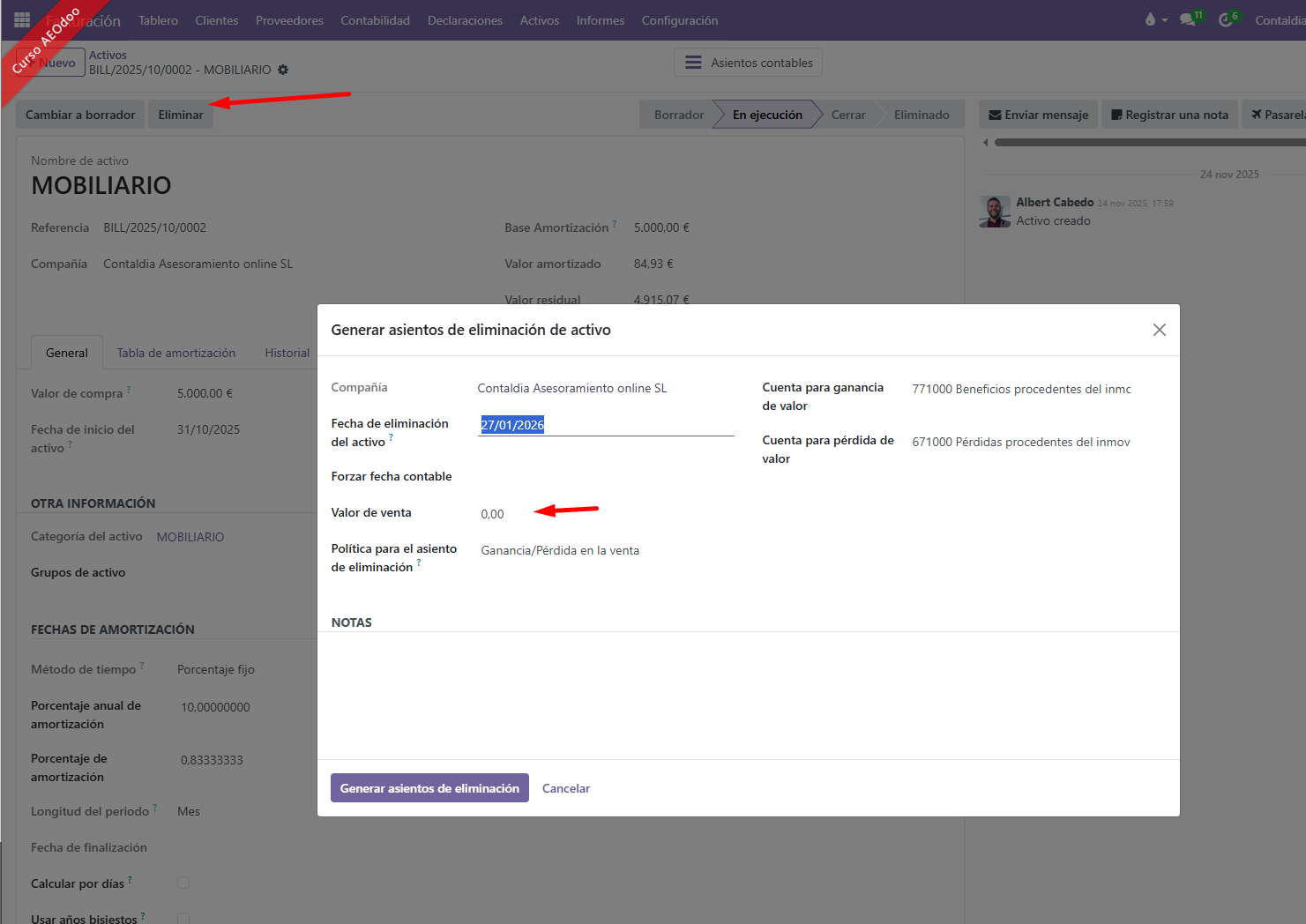 En contabilidad, activos, dentro de cada activo tienes la opción o botón arriba de ELIMINAR, CANCELAR, ese botón, te genera un asiento de venta del mismo. Es importante tener todo bien amortizado hasta la fecha y también bien configurado las cuentas de ingreso y gasto del modelo de activo. Odoo te realizará el asiento correctamente.