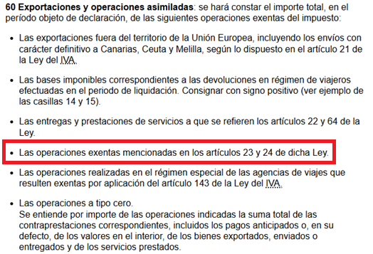 Hola, ojo con esto, las exenciones son de varios tipos y la que debe aparecer en la casilla 60 efectivamente corresponde a la exención referida en la ley del iva en los artículos 23 y 24, pero la exención para asociaciones, y otras muchas, se detallan en el artículo 20, en ese caso funciona de manera distinta, y esa no debe aparecer en el modelo 303. Se deben crear dos grupos de impuestos diferenciados para uno y otro caso, uno sí va al modelo 303 y el otro no.
